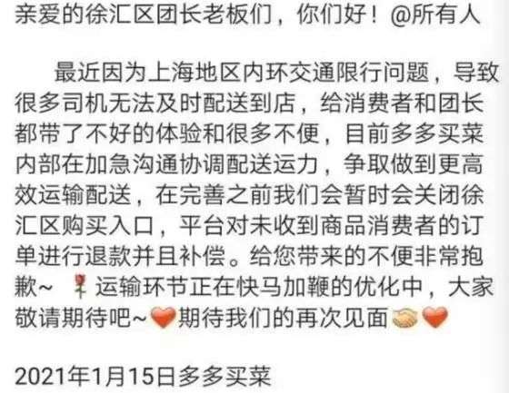 马刚庆的担忧,在多多买菜上海徐汇区供应商身上成了事实。据知情人士爆料,1月15日,多多买菜在徐家汇区域开业第三天便宣告暂停,多多买菜给出的解释是“内环限行导致无法及时配送”。