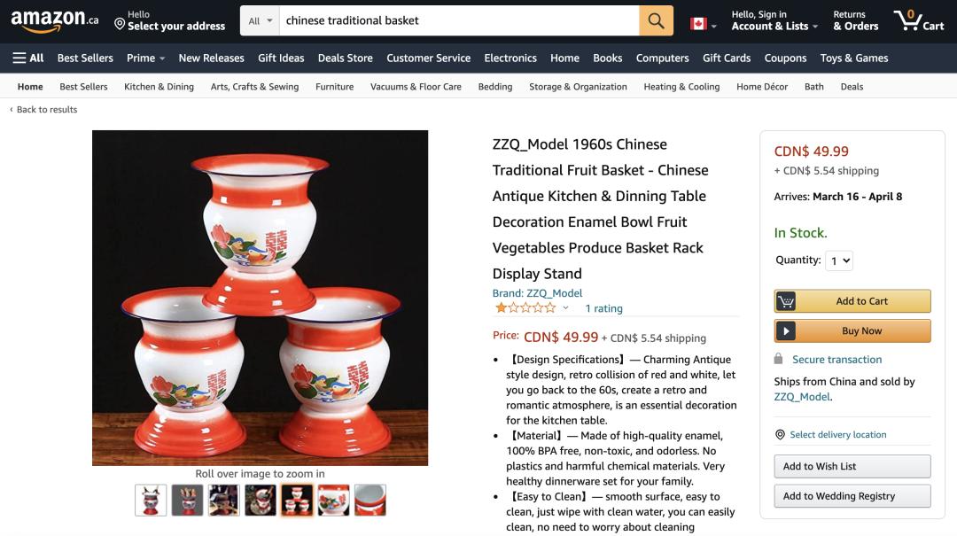 以前很多中国家庭用来吐痰盛尿的痰盂,在亚马逊上成功实现了「逆袭」,摇身一变成了「 1960s Chinese Traditional Fruit Basket」(中国 20 世纪 60 年代的传统水果篮),身价高达 60 美元左右,折合人民币约 380 元。