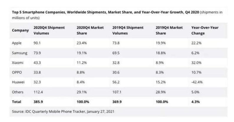 简单来说,华为过去最重要的业务智能手机遇到了前所未有的困难,无论是国内市场还是国际市场,份额都出现了严重的下滑。根据IDC公布的数据,2020年第四季度华为手机的全球出货量已经下滑到第五的位置,距离“Others”只有一步之遥;在国内市场,华为手机的市场占有率从41.4%下滑至25.1%,“勉强”能够保住国内冠军,但领先幅度已经十分微弱。
