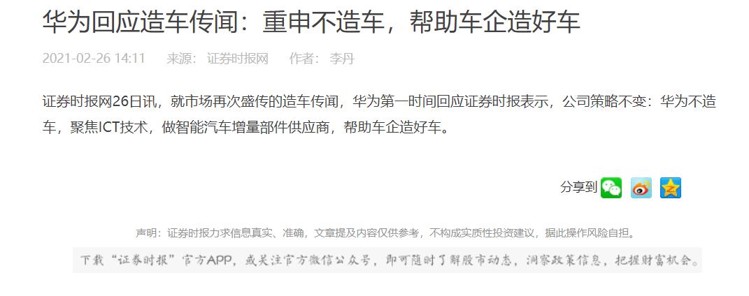随后华为通过证券时报网正式作出回应,表示“公司策略不变,华为不造车。”