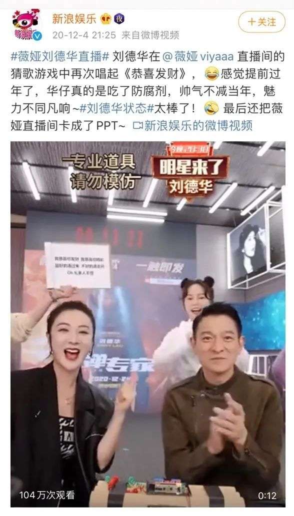 去年12月,电影《拆弹专家2》主演刘德华进入薇娅直播间,两人合唱刘德华经典曲目《恭喜发财》的视频片段在微博上获得超100万次播放。