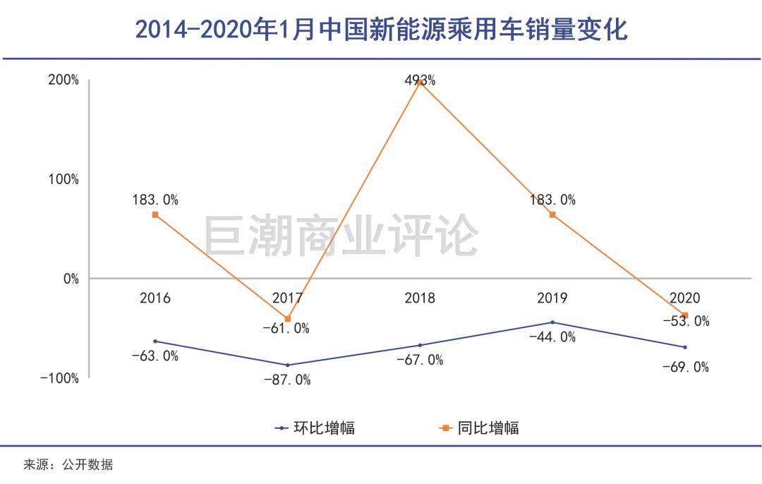 翻看2014年-2020年的数据,我们能够看到,整个中国的新能源汽车销售量,每年1月的同比数量都在增长,但环比上一年12月,都出现了不同程度的下跌。