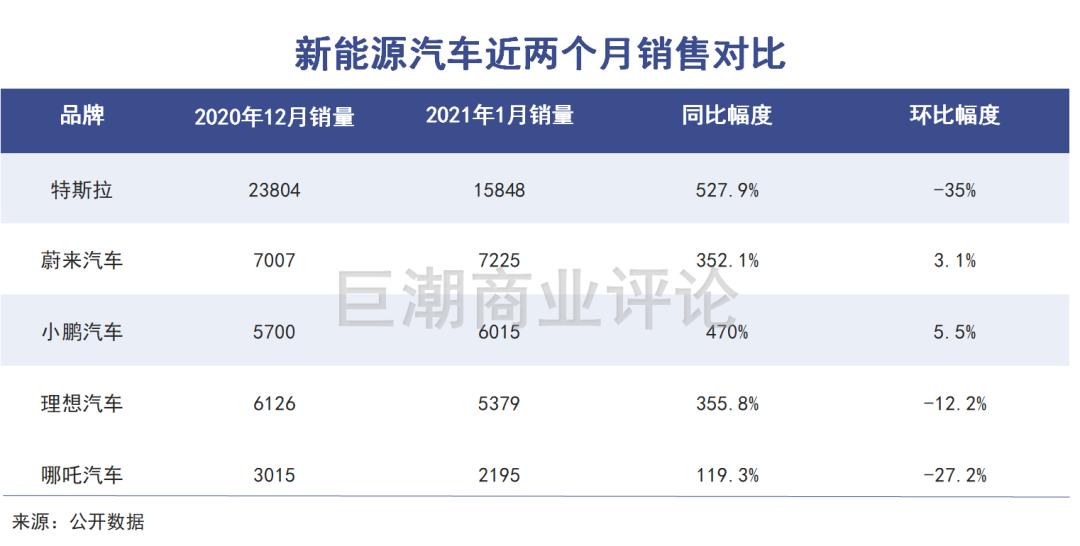 粗看之下,新势力们的市场表现还不错,但2021年1月相比2020年12月环比增长的数字并不好看。