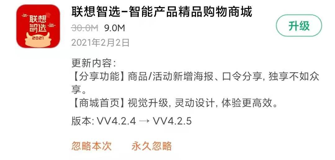 另外一种,则是针对界面UI设计进行重新设计,例如联想智选商城就会经常针对软件的UI设计进行升级。一般来说,已经步入成熟期,没有什么功能可以更新的App就会经常这样做。这种做法可以通过视觉效果的更新,给予用户新鲜感,同时针对部分UI动画的优化,也能有效改善用户的使用体验。