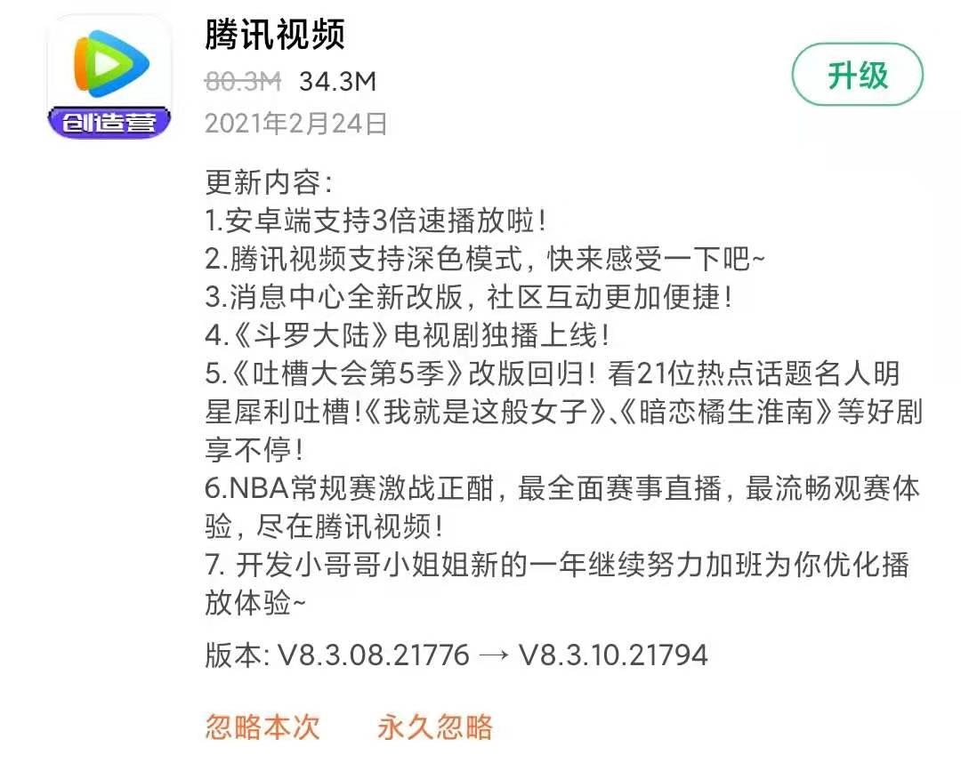 除此以外,有的应用的更新,只不过是为了提醒用户自家App的存在感,并适当提高用户的打开率。以腾讯视频为例,腾讯视频的更新日志中,超过一半文字都是在罗列自己的主要卖点,目的就是吸引用户尽快升级。不仅如此,刚刚更新的应用在应用市场上比较容易获得推荐位置,这样可以提升应用的下载量,让应用商店的数据更加好看。