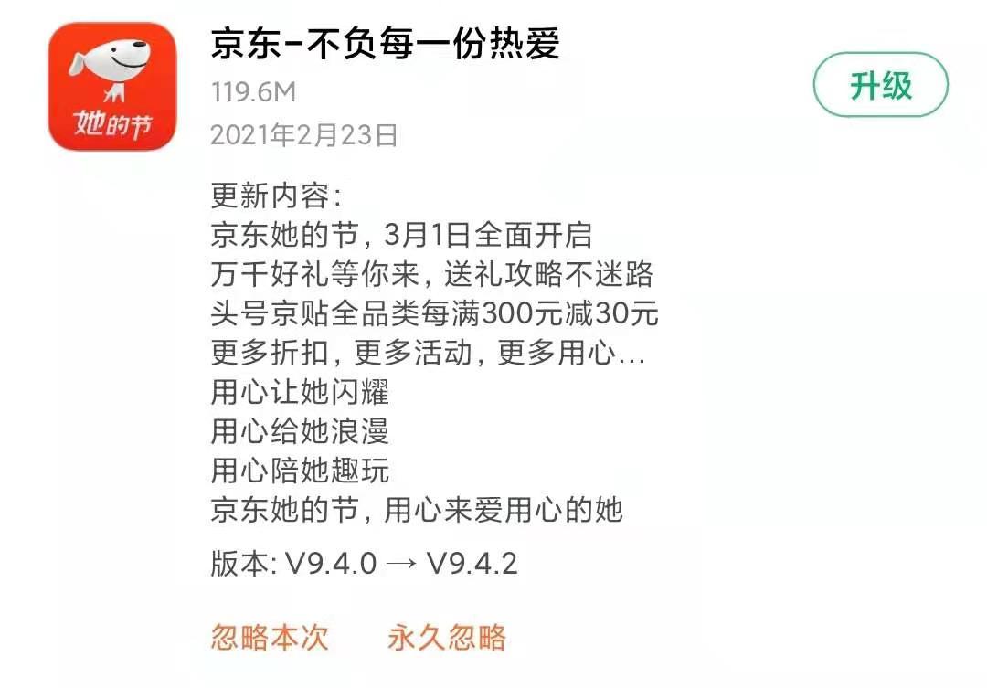 首先来看看京东商城的升级日志,如图所示,京东这次的更新内容主要是将App图标里的“年货节”更改为“她的节”,将新的电商活动展示出来。诸如此类因为各种购物活动,电商平台更换图标的更新,基本可以算作纯营销性质的更新,通过在图标上打出活动关键词来吸引客源。
