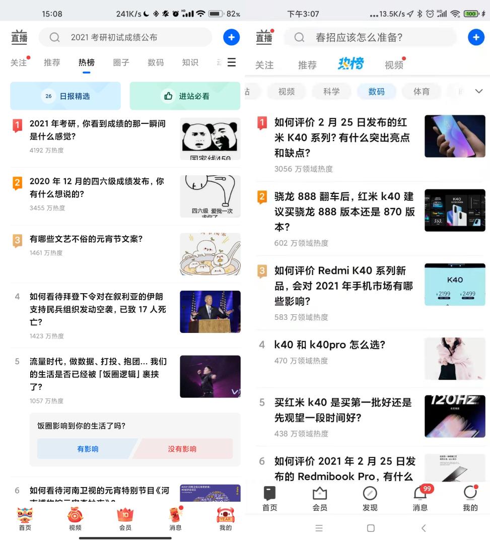这种情况可谓屡见不鲜,以知乎为例,安卓版知乎在近期更新了自己的主界面设计。如图所示,旧版知乎可以在热榜界面下直接切换榜单分类,快速浏览当前热榜。新版知乎则取消了热榜界面的榜单分类,而是将所有页面一股脑放在主界面的顶部,用户需要进入数码页面后才能进入数码分类的热榜。这样的UI设计方式,既不直观也不好用,属实迷惑操作。