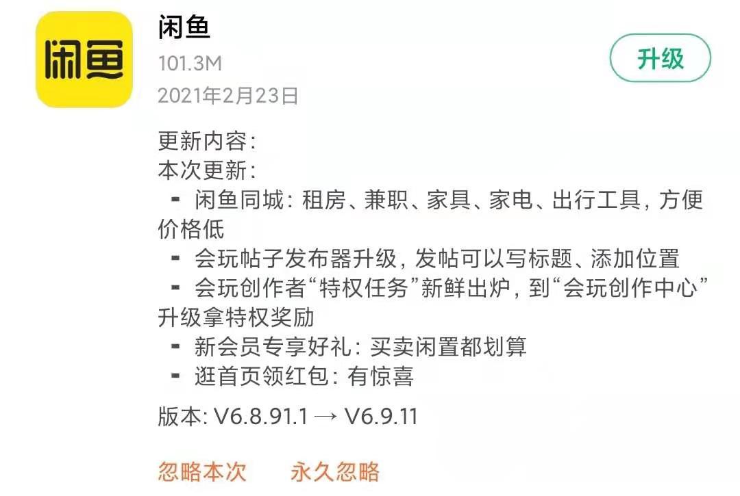 当然,更多的软件更新还是在持续推出新功能。以二手交易平台闲鱼为例,本次闲鱼更新正式推出同城业务,涵盖了租房、兼职等多个业务模块。闲鱼曾经不过是一个单纯的二手交易平台,随着产品的不断更新,闲鱼不断推出鱼塘、玩家、直播、优品捡漏等业务板块,社区意味愈发浓厚。