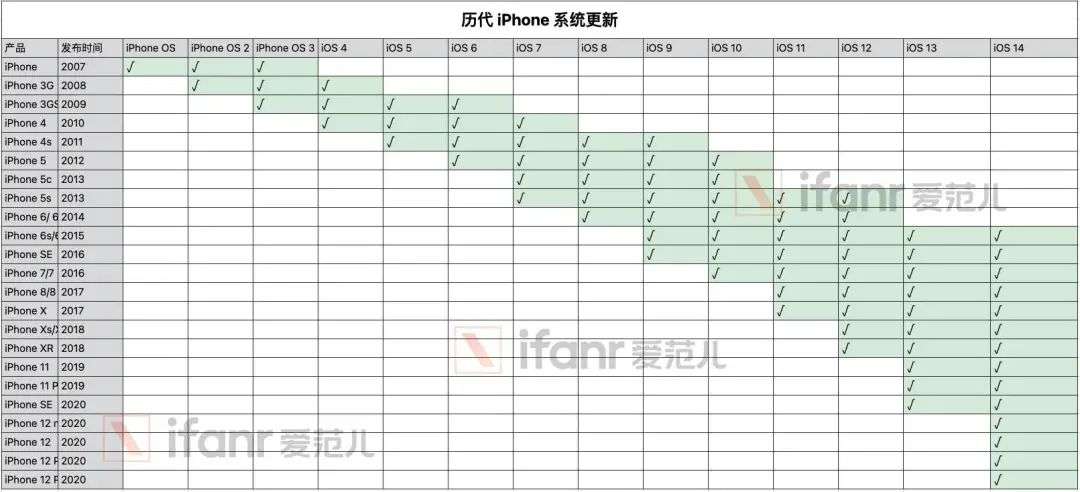 ▲ 我们统计了历代 iPhone 所支持更新的 iOS 系统