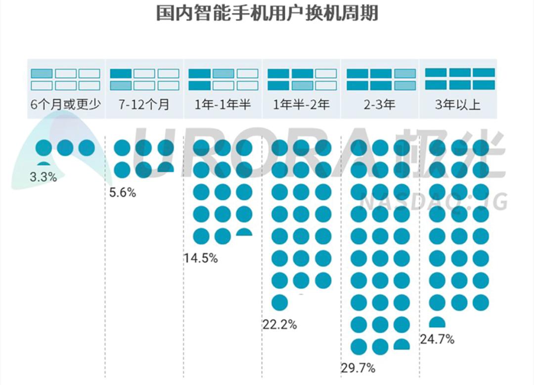 极光大数据在 2019 年末发布的研究报告中就提到了国内智能手机用户换机周期 2 年以上的用户占比达到了 54.4%,换机周期 3 年以上的用户也达到了 24.7%。