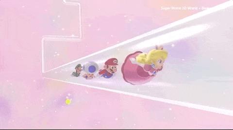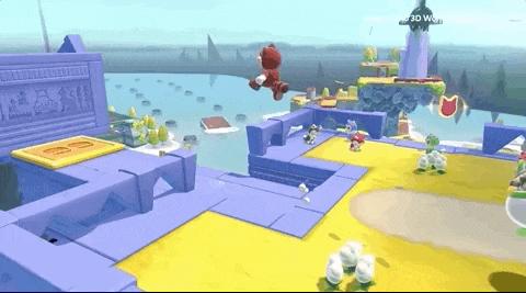 在《3D 世界》里,玩家可以操作的 4 个角色(还有 1 个隐藏角色)各有不同的能力特点,马力欧能力均衡,路易基脚底滑但是跳得高,奇诺比奥冲刺起来更快(头铁),桃花公主可以滞空一段时间,但是移动相对较慢。