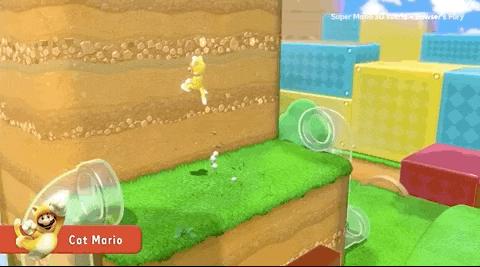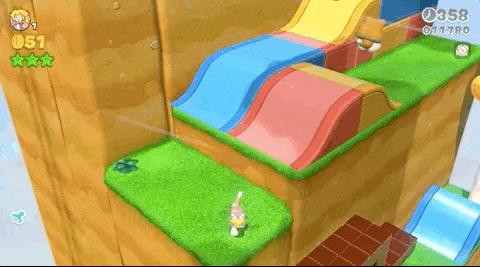 地图 3D 化后,马力欧过关不再是简单地从左端跑到右端,在大多数关卡中「攀上高地」都是过关的关键,而「全新」的猫咪状态加入则可以让玩家更加从容地适应 3D 世界的多维运动。