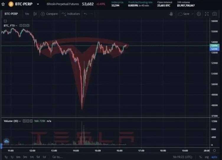 有人调侃,特斯拉在比特币价格走势图上「刷了个寂寞」. 图片来自:omid(推特)