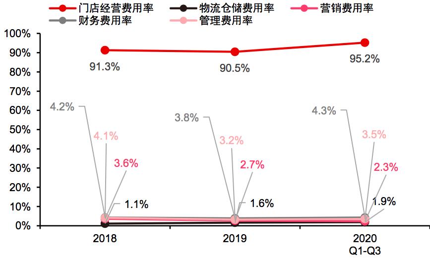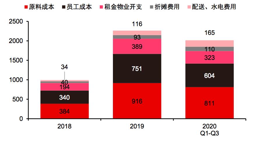 疫情之前,奈雪门店的经营费率基本维持在91%上下。而2020年前三季度,受制于疫情影响以及奈雪门店规模的持续增长(开店95家),奈雪门店的经营费率上升至95.2%。