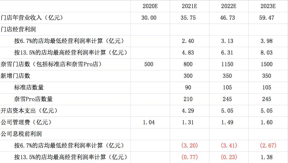 不过,由于历史时间参考较短,且存在2020年疫情带来的非常情况,按照普遍情况,公司管理费用大概率存在明显规模效应,我们按照逐年递减的管理费用推算,2020年至2023年的奈雪管理费用分别为1.04亿元、1.31亿元、1.49亿元和1.60亿元。