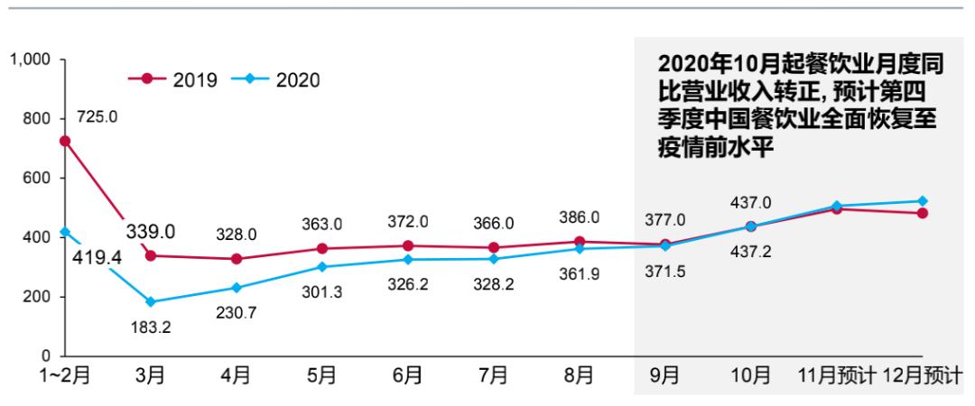 图1:2019年和2020年中国餐饮营收月度数据(亿元),来源:沙利文
