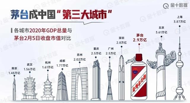 有媒体将2月5日茅台的收盘市值,对比各大城市2020年GDP总量,称茅台为中国“第三大城市”。这种类比很大关注,尽管未必严谨准确,但它实在地指出了,茅台在中国资本和商业市场中的特殊地位。