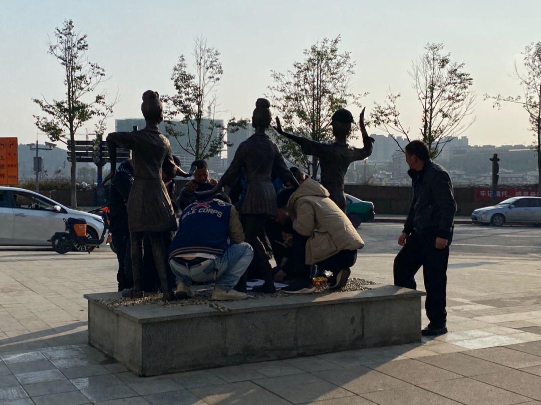 贵州机场酒业公司贵阳提货点临近一天中营业停止的时间,茅台酒黄牛们或蹲或站,围在门口三个贵州少数民族女孩的雕像下,正沉迷于“炸金花”——一种用3张牌比大小的纸牌赌博游戏。