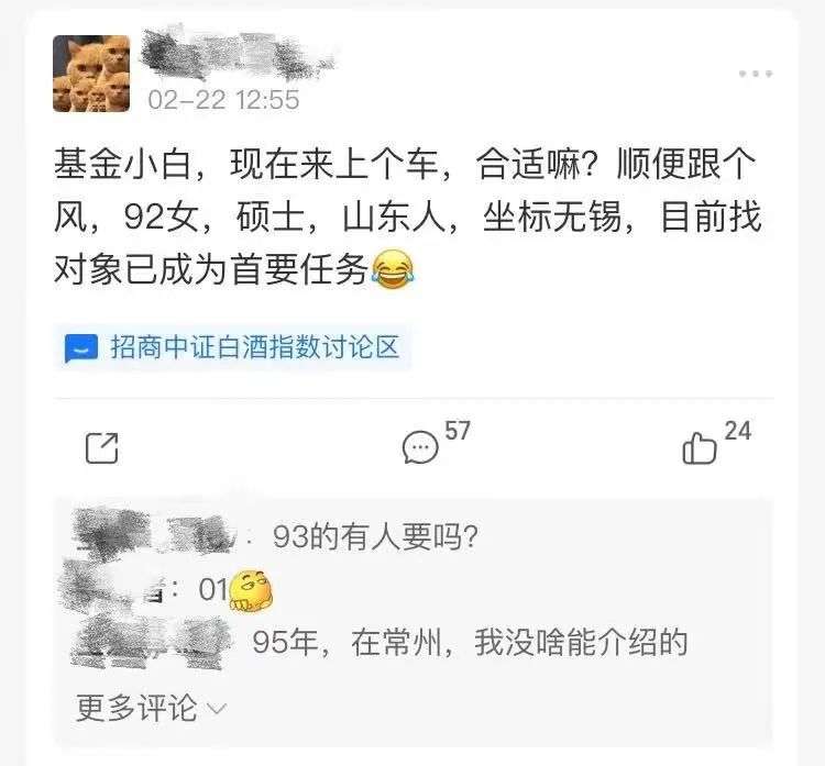 第一批相亲贴的身影,出现在热门的招商中证白酒指数基金的讨论区中。“你们赶快相亲,然后闪婚,再宴请亲朋好友买几箱茅台?让白酒多涨些!”紧接着,在类似的调侃下,相亲贴很快在支付宝理财的其他讨论区冒出,攻进了易方达、诺安等多个热门基金讨论区。