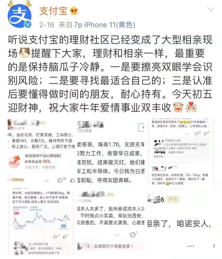 在刚刚过去的春节期间,支付宝等App的基金讨论区涌入了大量的“相亲”留言贴。基金休市、假期空闲,不少年轻人纷纷在讨论区晒出自身条件、收益情况,寻找有缘人。