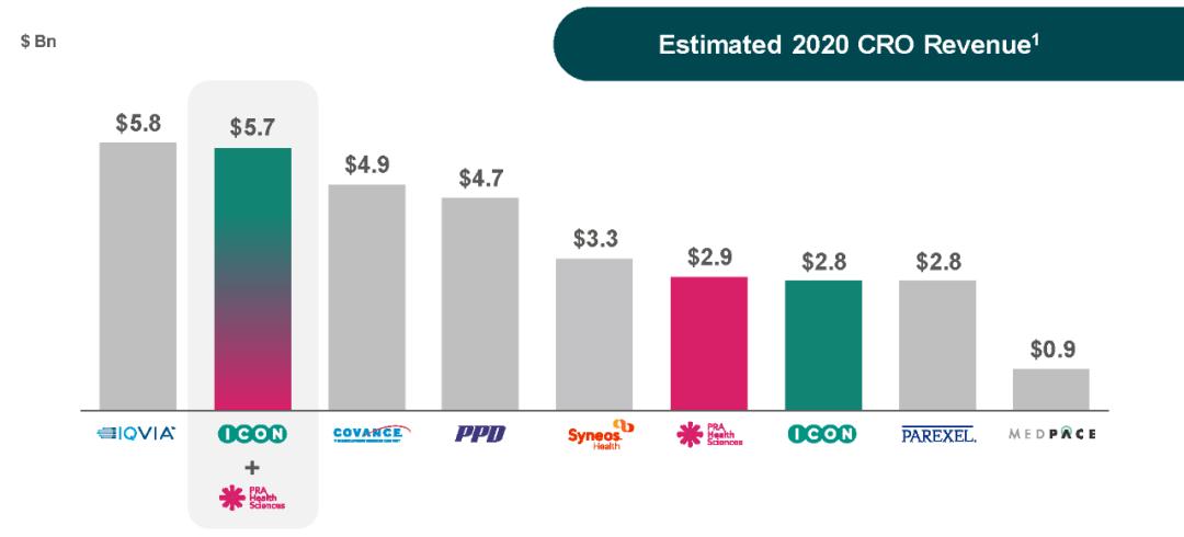 合并成功后,使ICON将跃升为仅次于IQVIA的全球第二大CRO企业。根据财报,目前全球CRO领域,PRA排名第五,ICON排名第六。IQVIA也是2016年由IMS Health和Quintiles进行的170亿美元以上巨额合并产生的。