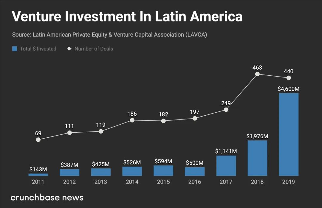 2019年3月,软银宣布设立50亿美元的 Softbank Innovation Fund(SIF),用于定向投资拉美的科技企业。消息一出,全球资本掀起了一波进军拉美的热潮,使得当年拉美初创企业获得的 VC 融资总额相比2018年翻了2.3倍。