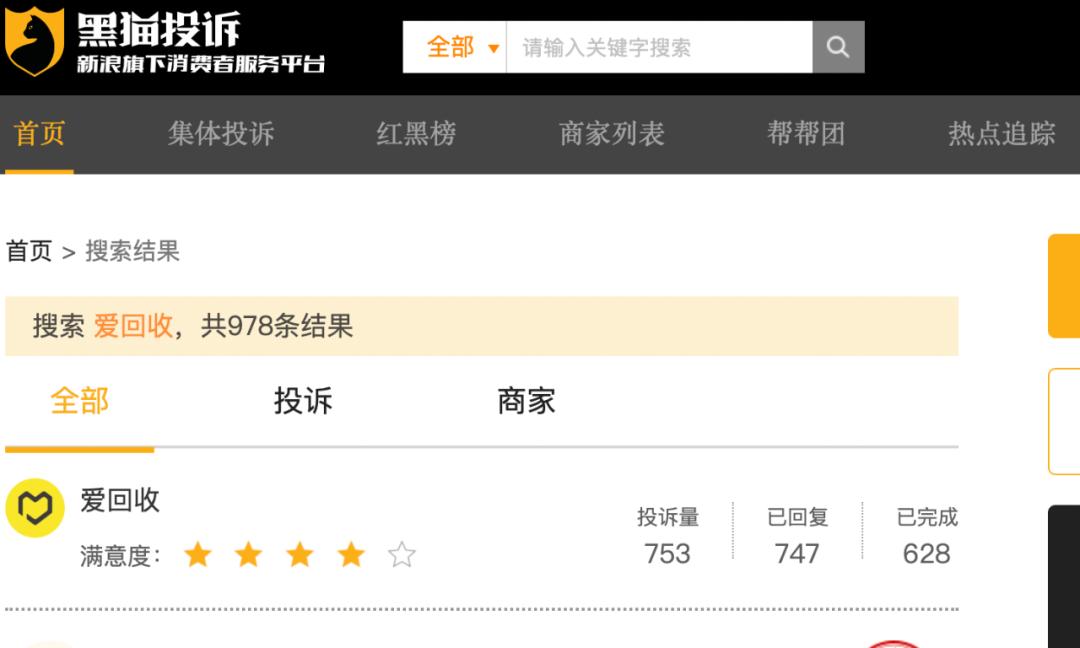 根据第三方平台黑猫投诉信息显示,搜素爱回收、拍拍关键词,一共有多达上千条用户投诉,其中不乏有相关质量问题投诉。