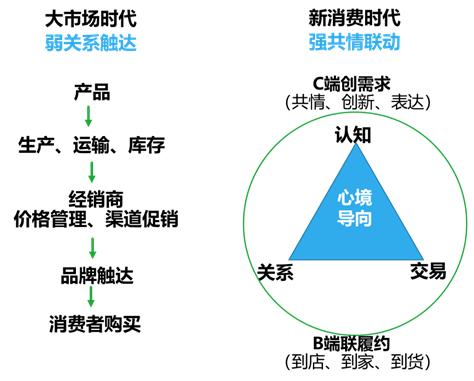 大市场时代是产品导向、渠道为王,标准增长公式为国民化大单品+洗脑化大传播+压货式大分销+流量式大出货,本质商业逻辑是供给重于需求、货找人的弱关系触达。
