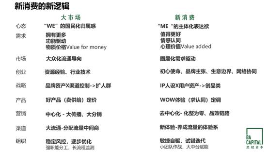 在黑蚁资本看来,从追逐“WE”的国民化归属感到热衷于“ME”的主体化表达欲,新一代消费者自我意识觉醒所带来的消费行为改变,带动了消费市场从大众化流通导向变成了圈层化需求驱动。而圈层化是完全不同于大众化的一个全新的市场结构,从而也形成了新消费“从心出发”的新商业逻辑。
