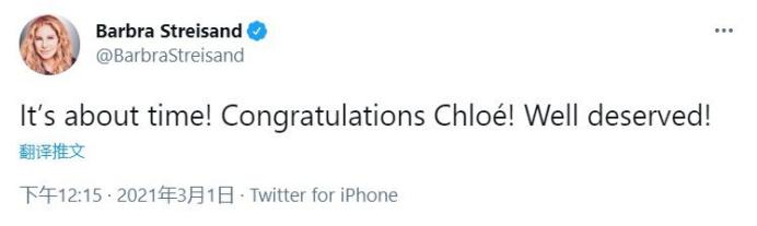 金球奖史上第一位获奖的女导演是芭芭拉·史翠珊,凭借自编自导自演的电影《燕特尔》拿奖;第一位获奖的亚裔导演则是李安,凭借的是《卧虎藏龙》拿奖。在赵婷获奖后,芭芭拉·史翠珊也发推祝贺赵婷,并称:“(属于女性的)时机到了!”