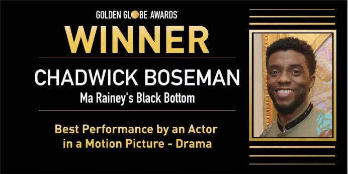 剧情片最佳男主角的得主无悬念地落在了已故男演员查德维克·博斯曼身上, 他也成为接下来奥斯卡最佳男主角的头号种子选手。他的遗孀泰勒·西蒙尼·莱德沃德也替他发表了获奖感言,情到深处不禁潸然落泪,令人也无比感动和怀念。