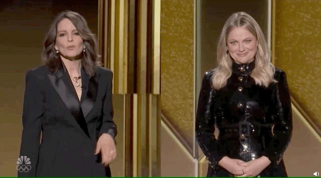 再比如,当介绍到本届金球奖的入围作品时,蒂娜吐槽入围影片之一的《芝加哥七君子审判》,说她喜欢艾伦·索金,虽然他只拍了七个男人在说话,但是看起来就像是几百个男人在吵架(吐槽艾伦·索金台词密集、语速快的风格);艾米还开玩笑介绍了今年入围最佳导演的人选:“包括雷吉娜·金、赵婷、埃默拉尔德·芬内尔和另外两位导演,但是对不起我们没时间啦就不一一介绍啦(暗示不给男性导演出场机会)。”