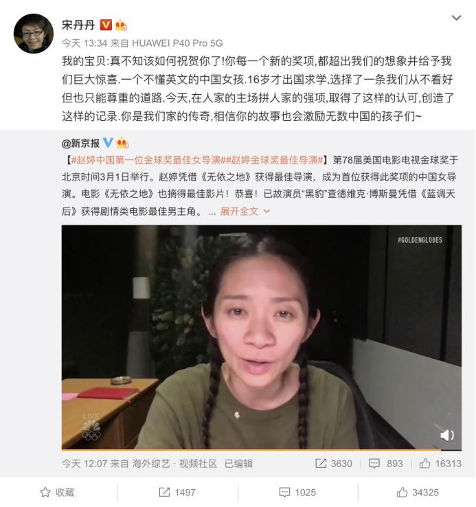 ▲ 赵婷继母宋丹丹发微博祝贺女儿获奖
