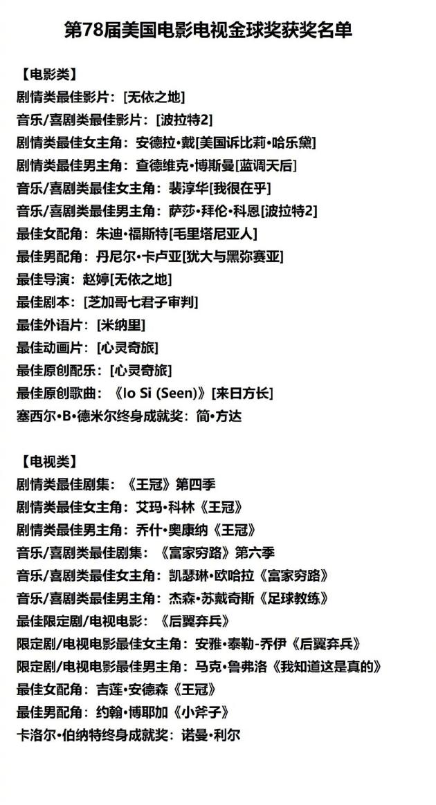 我们先来看看今年的金球奖颁奖结果吧,主要还是来看看电影类的奖项。