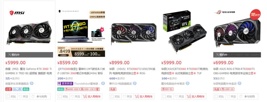 这并不是一句凡尔赛。当然大家可能看了 RTX 3060 系游戏本 7000+ 的价格觉得我就是在凡尔赛,可是当我们在某东上搜索 RTX 3060Ti 显卡时,就能够发现,现如今我们若想买一块 RTX 3060Ti 显卡,少说也要 6000,贵的时候甚至到了 8000 多。