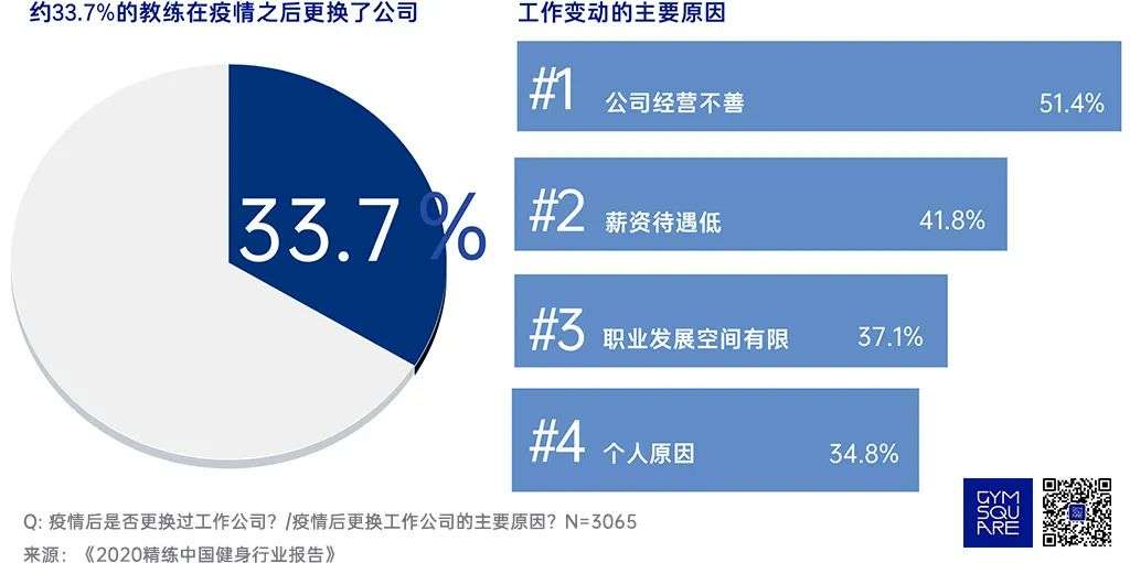 根据精练GymSquare《2020中国健身行业报告》显示,2020年教练的流失率达到33.7%。尽管疫情导致的健身房难以为继是教练离职的一大客观因素,但教练的流失问题一直存在。