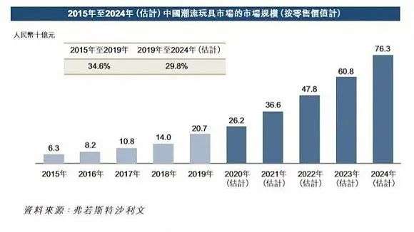 弗若斯特沙利文的报告显示,中国的潮流玩具零售市场仍处于早期阶段且快速增长,其市场规模预期在2024年将达763亿元,自2019年起的复合年增长率为29.8%。