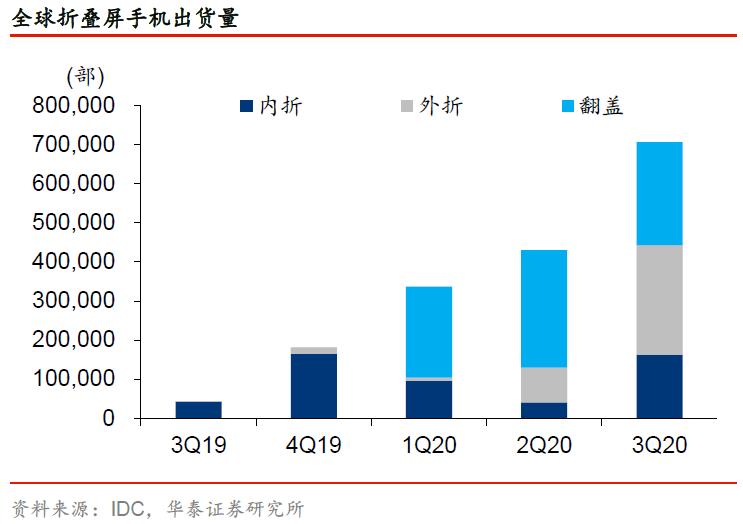 2020年第三季度,全球折叠屏手机出货量已达70.66 万部,这一数据在2019年第三季度,仅为4.35万部。其中三星以55.3%的市场份额处于领先地位。在2019年,全球折叠屏手机出货以内折为主,但是到2020年,全球折叠屏手机中内折、外折、翻盖均实现较高出货量。