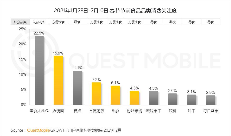 根据QuestMobile数据显示,2021年春节前夕,零食大礼包依然是人们关注度最高的食品类产品,但同时,人们对于方便面、方便粥饭、熟食、粉丝米线等方便食品的关注度也相对很高,“小家庭”过年更喜欢简洁随心的方式。
