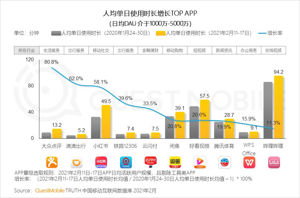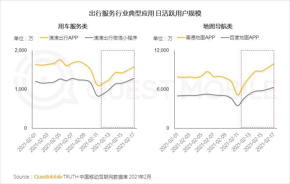 3、从去年完全的出行限制到今年鼓励就地过年,春节期间人们对于本地出行、娱乐等方面的应用使用有显著提升