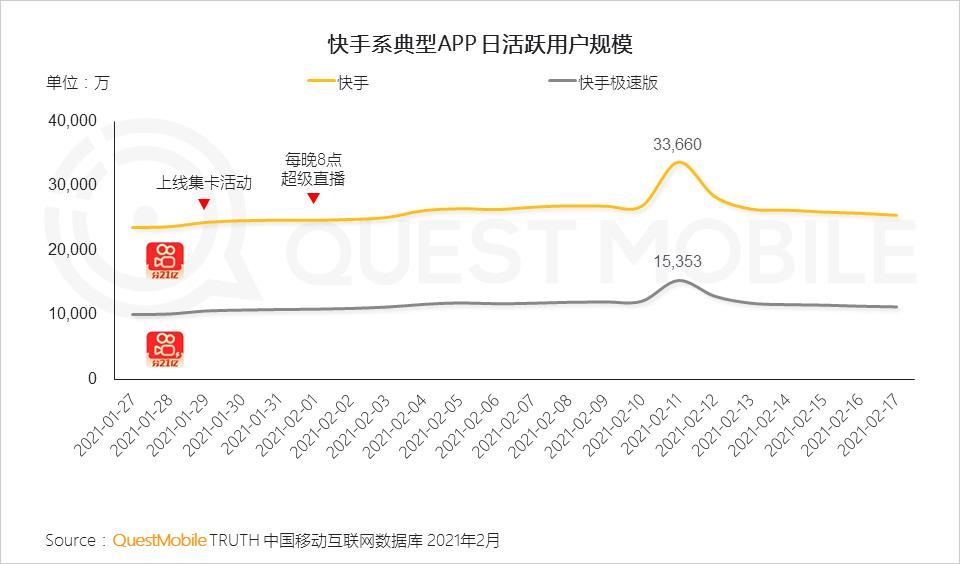 2.3 快手系:快手双应用联合打造集卡分红包+超级直播+多卫视春晚合作组合拳,在除夕夜迎来流量高峰