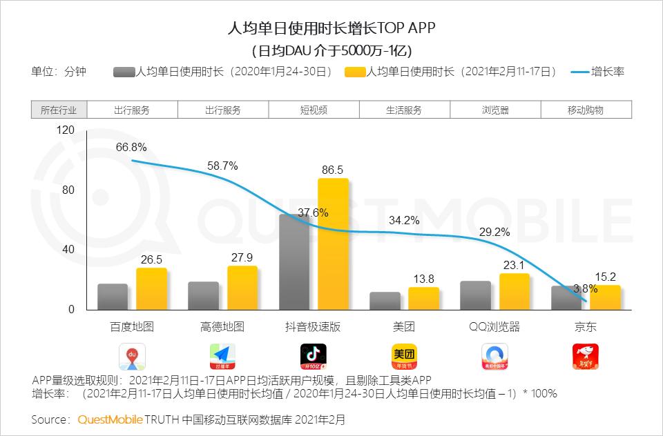 随着行业增长和春节营销的大力加持,拼多多和快手、抖音成为今年春节大赢家,拼多多人均单日使用时长农历年同比增长达25.9%,快手、快手极速版、抖音、抖音极速版人均单日使用时长农历年同比增长也分别达9.0%、4.7%、1.9%、37.6%。此外,出行服务、生活服务、移动购物等行业也出现了较高增长,例如,百度地图增长了66.8%、美团增长了34.2%、京东增长了3.8%。