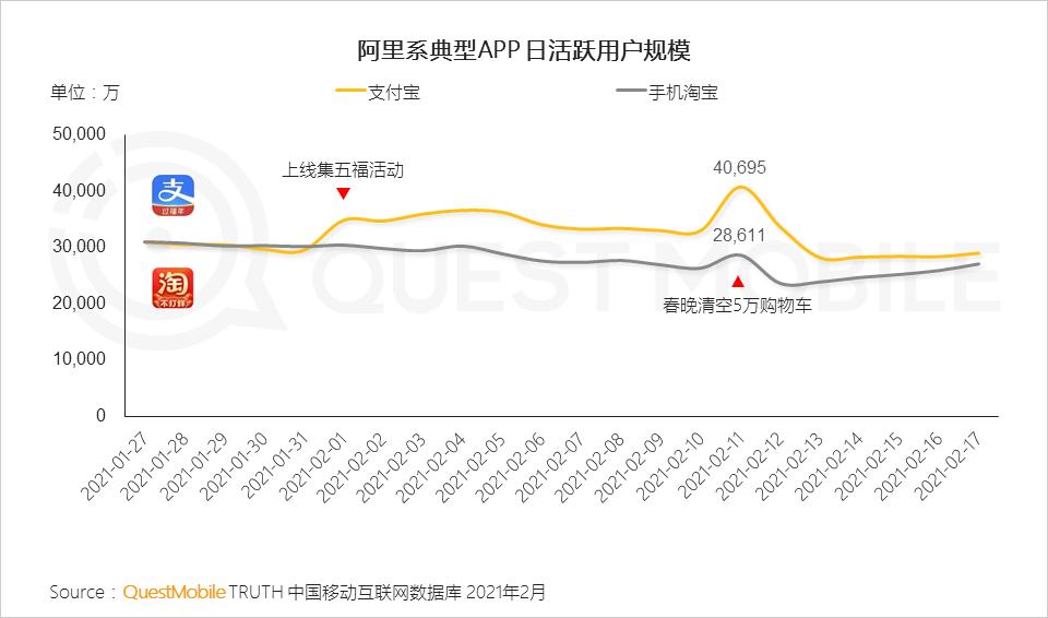 2.1 阿里系:支付宝继续保持集五福传统,已成为人们过年的习惯动作,淘宝作为央视春晚独家电商合作伙伴,在除夕夜迎来流量小高峰