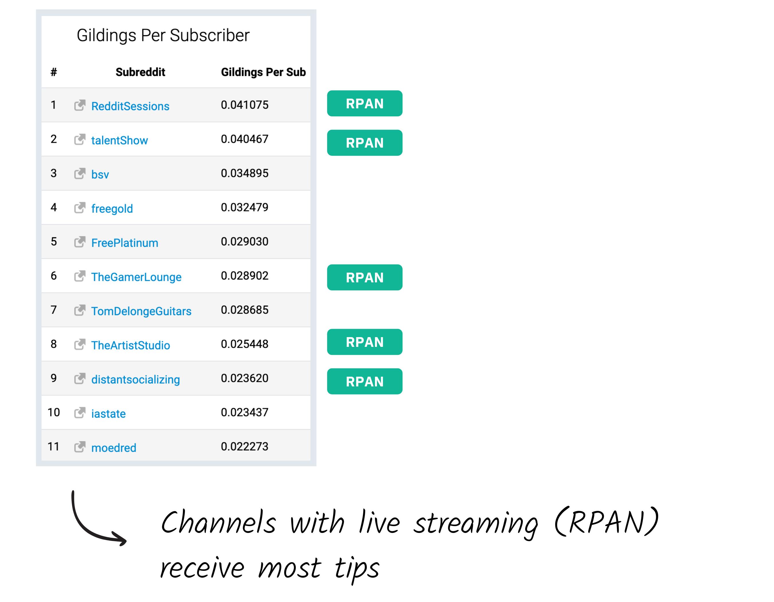 其次,RPAN强化了消费行为。除了出售广告以外,Reddit还通过向会员出售“coin”来获利。出售的硬币然后可以用来付小费或者对其他用户为普通所做出的贡献提供“gild”(给予奖励)。来自Subreddit Stats的数据表明,在RPAN可用的社区当中,订户平均给予的奖励额是最高的。