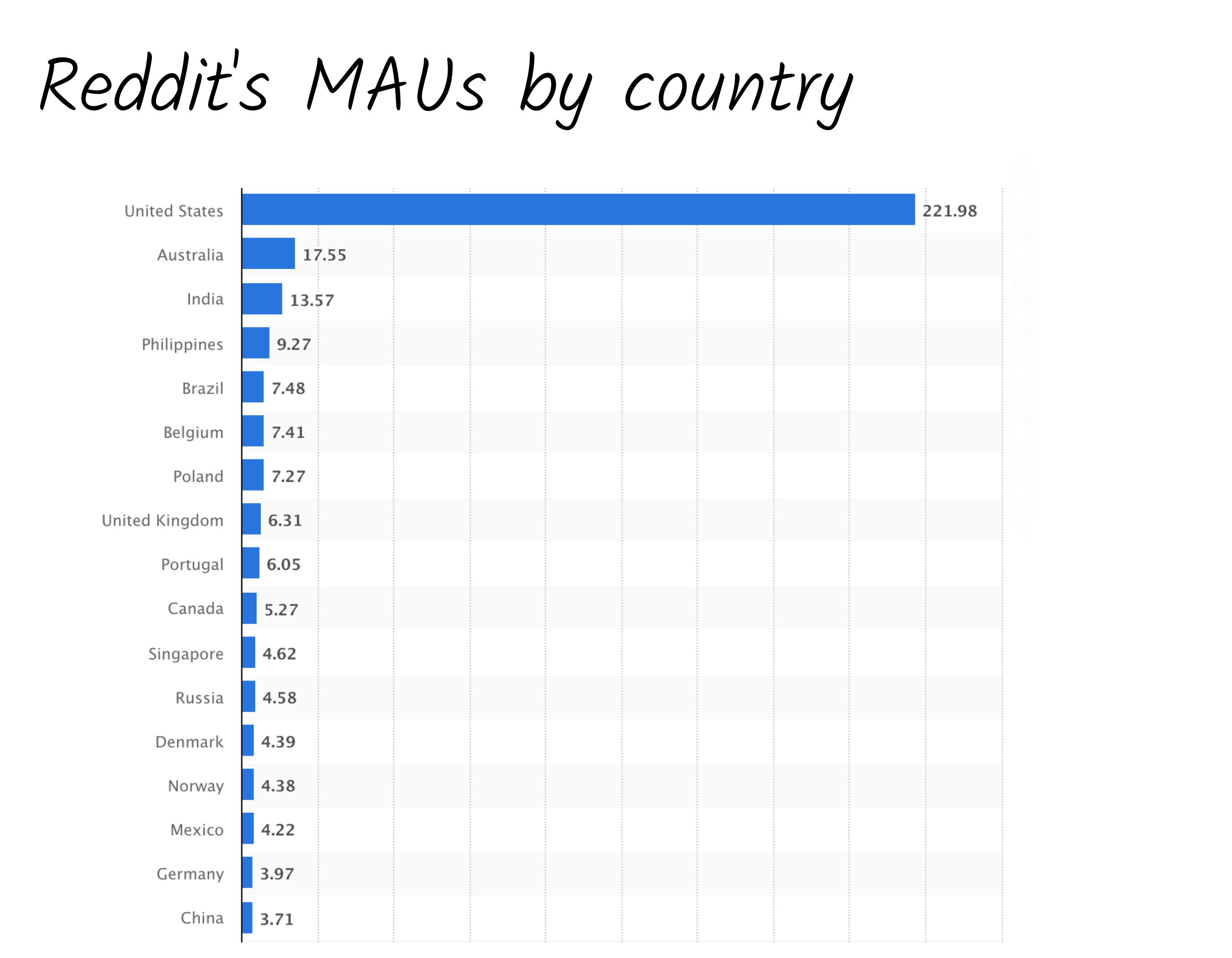 尽管Reddit在美国非常流行,但在美国以外的粉丝却相当有限。在大约4.3亿的用户当中,有2.22亿来自美国,占比超过了50%。榜首之后的跌幅很严重,澳大利亚提供了第二大的用户源,为1750万,印度排名第三,超过了1350万。