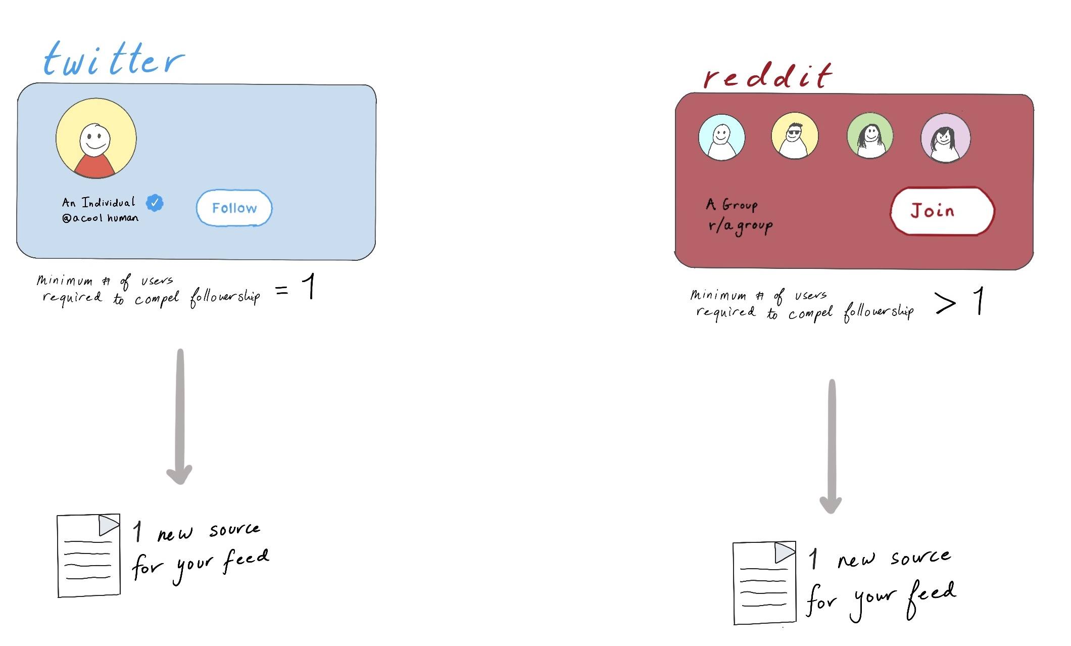 Reddit稍微有点不同。你不必关注个人(可以,但是不是默认值),而是选择关注社区,并且只有涉及到的用户达到一定数量时,社区才有价值。所以,给你的动态消息创建新来源所需的最小可行用户数更高。