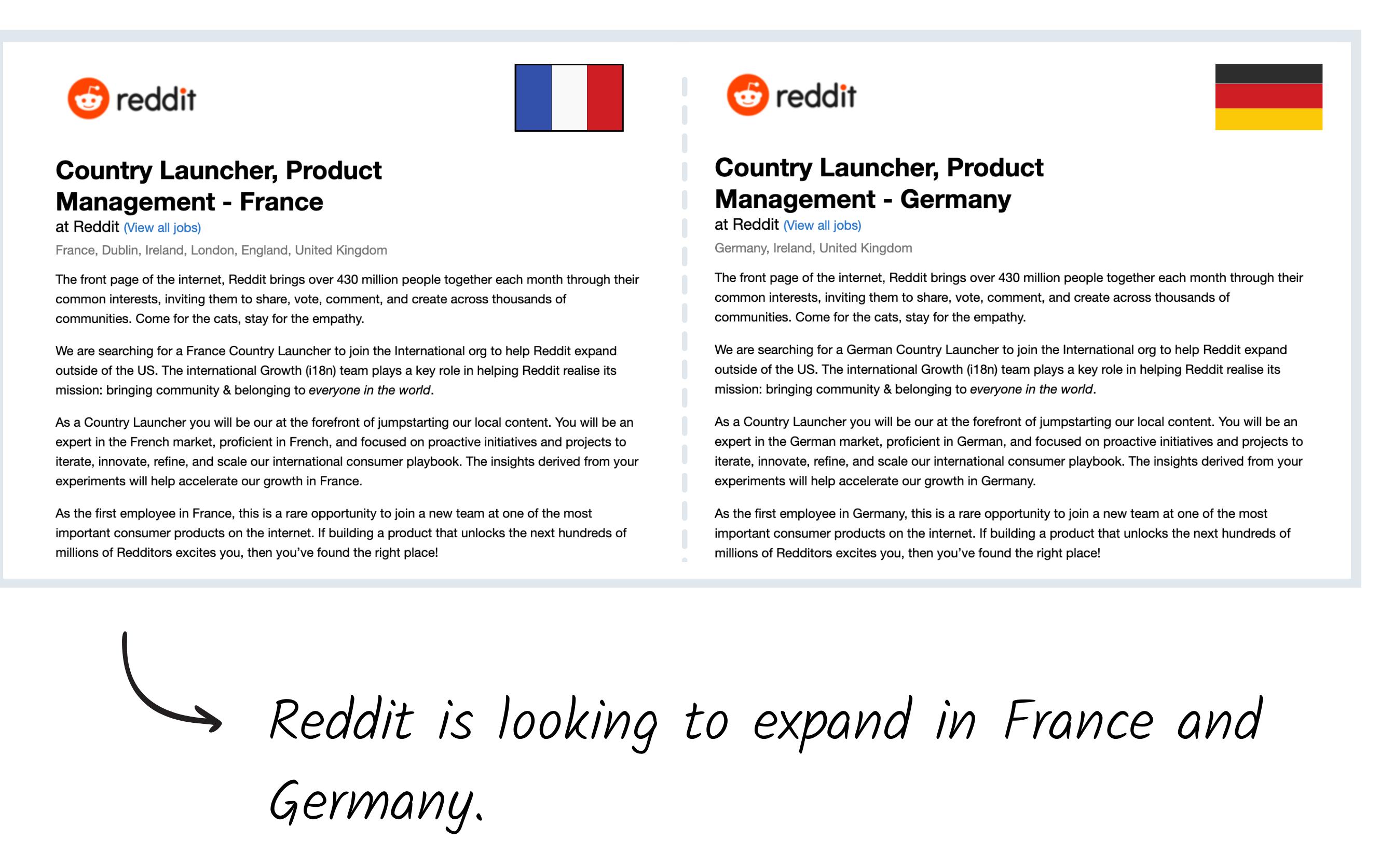 这些都算是有趣的选择。法国和德国都比较富裕,拥有大量说英语的人口,所以更容易起步和发展或维持ARPU。此外,在这些国家/地区设立专门机构可以让Reddit积累德语和法语的本地内容。这两个地方现在市场都不大:德国的Reddit用户不到400万,而法国只有100万。所以Reddit是有机会从这两个市场获得可观收入的。