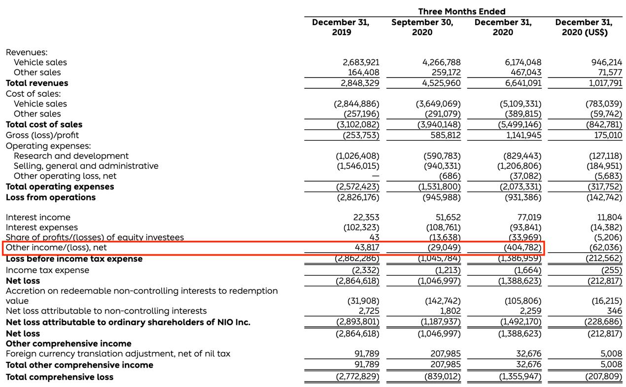 2020年第四季度经营性亏损(loss from operation)为9.314亿元人民币(1.427亿美元),同比下降67.0%,环比下降1.5%。之所以会造成净亏损增加,主要还是因为蔚来其他收入部分的亏损激增。蔚来并未表明具体原因,仅在电话会议中表示,亏损环比扩大主要是源于汇率波动所致,完整的答案也许在发审计后的全年报才能知晓。