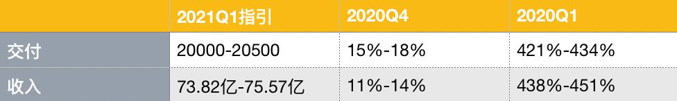 除了Q4财报之外,蔚来对于2021年Q1的指引也略低,公司预计,2021年第一季度车辆交付量将达到20,000和20,500辆之间,较2020年第一季度增长约421%至434%,较2020年第四季度增长约15%至18%。