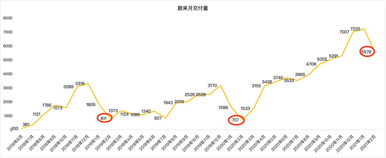 交付预期如此之低,或许与季节相关。从刚刚公布的电动车交付数据来看,蔚来2021年1月,交付量为7225辆,2021年2月为5578辆,同比分别增长352%和689%。2021年2月,交付的车辆包括1327辆ES8、2216辆ESs6和2035辆EC6。